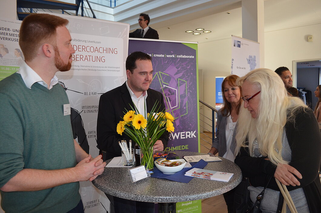 Die Wirtschaftsförderung Leverkusen und das zukünftige Startup-Zentrum "Probierwerk" waren mit vor Ort und standen den Gründungswilligen mit Rat und Tat zur Seite. Mit im Gepäck: Alle Services, die das Probierwerk anbieten wird - von Startup-Services bis Corporate-Services. Diese finden Sie auch hier.