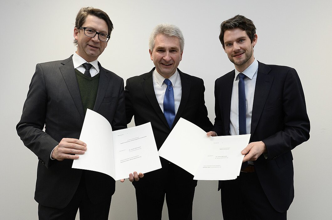 Foto (©MWIDE NRW/R.Pfeil): Wirtschafts- und Digitalminister Prof. Dr. Andreas Pinkwart (MItte) bei der Übergabe der Förderbescheide an WfL-Geschäftsführer Dr. Frank Obermaier (l.) und WfL-Projektleiter Sebastian Hahn (r.).