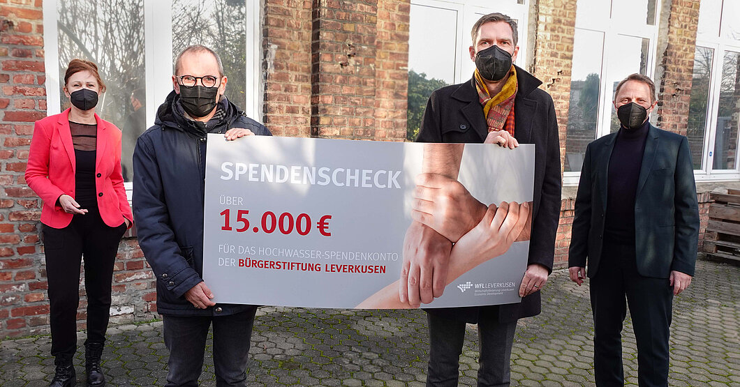 Am Mittwochmittag nahm Bürgerstiftung Leverkusen-Geschäftsführer Manuel Bast den Spendenscheck von Oberbürgermeister Uwe Richrath, WfL-Aufsichtsratsvorsitzende Claudia Wiese und WfL-Geschäftsführer Markus Märtens entgegen. „Wir sind täglich im Kontakt mit Leverkusener Unternehmer:innen, die auch nach einem halben Jahr noch nicht zur Normalität zurückkehren konnten und versuchen bestmögliche Unterstützung bei allen Problemstellungen zu leisten. Dazu gehört für uns auch, die Aufmerksamkeit weiterhin auf das Thema zu lenken und mit unserer Geldspende hoffentlich einen wertvollen Beitrag für Leverkusens Bürger:innen und Unternehmer:innen leisten zu können“, resümiert WfL-Chef Märtens.